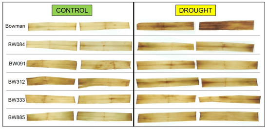 Accumulation of hydrogen peroxide in representative leaf fragments of each genotype grown under the control and drought conditions. The H2O2 accumulation is visible as brown spots.