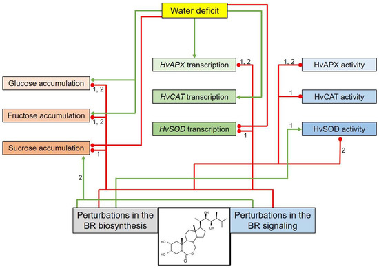 The major conclusions of the study provide insights into metabolic mechanisms of drought response in barley and the role of endogenous BRs in regulation of these processes. Green arrows indicate stimulation, whereas red lines with the bullet points represent suppression: 1, under the control conditions; and 2, after the three-week drought stress. Detailed description is given in the text.