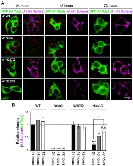 Figure 1. Cell surface expression levels of GluA1N363Q increase in a time-dependent manner. (A) Representative immunostaining images showing the cell surface expression levels of wild-type (WT) and mutant (N63Q, N257Q, and N363Q) GluA1. HEK293 cells were stained using an anti-GluA1 mAb (magenta; pseudocolor). The fluorescence intensity of green fluorescent protein (GFP; shown in green) indicates the total expression levels of individual GluA1 subunits. Scale bar, 20 µm. (B) Relative intensities of cell surface GluA1 WT and mutants at 24, 48, and 72 h post-transfection. The fluorescence intensity of surface GluA1 was normalized to that of GFP and GluA1WT at 24 h post-transfection. ***, p < 0.001; **, p < 0.01; *, p < 0.05; n.s., p > 0.05. Error bars represent the standard error of the mean (SEM).
