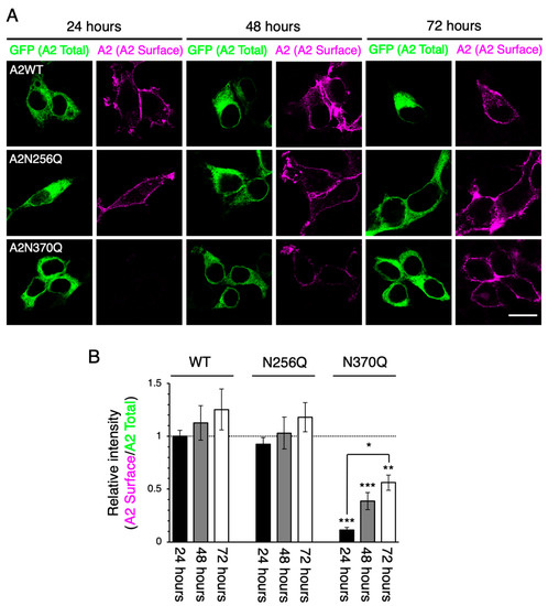 Figure 2. Cell surface expression levels of GluA2N370Q increase in a time-dependent manner. (A) Representative immunostaining images showing the cell surface expression levels of WT and mutant (N256Q and N370Q) GluA2. HEK293 cells were stained using an anti-GluA2 mAb (magenta; pseudocolor). The fluorescence intensity of GFP (shown in green) indicates the total expression levels of individual GluA2 subunits. Scale bar, 20 µm. (B) Relative intensities of cell surface WT and mutant GluA2 at 24, 48, and 72 h post-transfection. The fluorescent intensity of surface GluA2 was normalized to that of GFP and GluA2WT at 24 h post-transfection. ***, p < 0.001; **, p < 0.01; *, p < 0.05. Error bars represent the SEM.