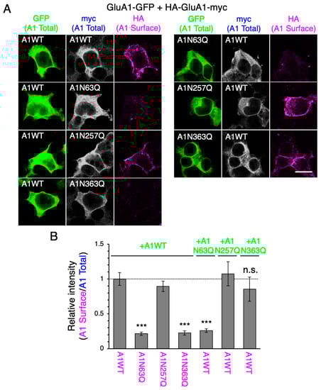 2.2. N-Glycan at GluA1N63 Is Essential for GluA1 Cell Surface Expression