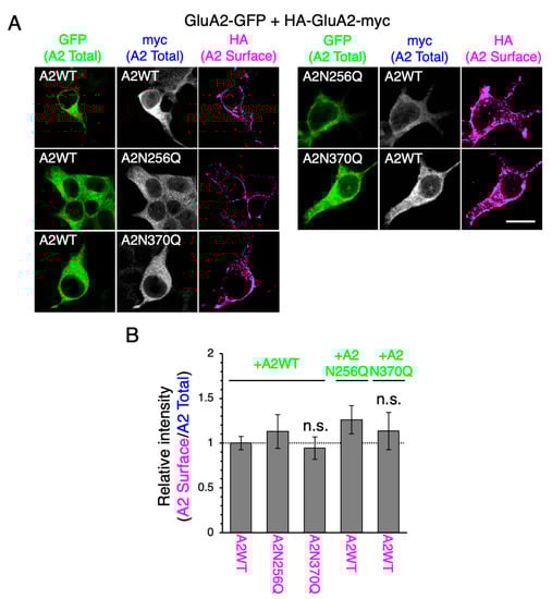 Figure 4. GluA2WT enhances the cell surface expression of GluA2N370Q. (A) Representative immunostaining images showing the cell surface WT and mutant (N256Q and N370Q) GluA2 tagged with HA and myc (at the N- and C-terminus, respectively) in HEK293 cells co-expressing GFP-tagged WT or mutant GluA2 (green). Images were taken at 24 h post-transfection. Surface GluA2 was labeled using an anti-HA mAb (magenta; pseudocolor) and total GluA2 was detected using an anti-myc pAb (white; pseudocolor). Scale bar, 20 µm. (B) Relative cell surface levels of WT and mutant HA-GluA2-myc in cells co-expressing WT and mutant GluA2-GFP. The fluorescence intensity of HA was normalized to that of myc and homo-oligomeric combination of WTs at 24 h post-transfection. n.s., p > 0.05. Error bars represent the SEM.