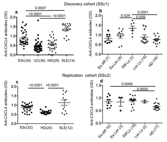 Anti-CXCL4 antibody reactivity is present in SSc patients. Sera (SSc1) (a,b) and plasma (c,d) (SSc2) and sera/plasma (see Table S1) of HD (healthy donors), UC (ulcerative colitis) and SLE (systemic lupus erythematosus) patients were tested for antibody reactivity to CXCL4 by ELISA as described in the Methods section. HD sera (a,b) or plasma (c,d) were used as negative controls, SLE sera (a) and SLE plasma (c) were used as positive controls. Positivity in patients was calculated as reported in the Methods section with respect to HD. In all graphs, horizontal bars are the mean, vertical bars are the standard error of the mean, p values are by Mann–Whitney test. Ea diff = early diffuse SSc; Ea Lim = early limited SSc; Diff Ls = diffuse long-standing SSc patients; Lim Ls = limited long-standing SSc patients (for early patients, disease duration is <5 years).
