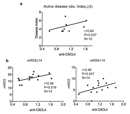 2.2. Antibody Reactivity to CXCL4 Correlates with Disease Score and Modified Rodnan Skin Score (mRSS) in Patients with Active Disease