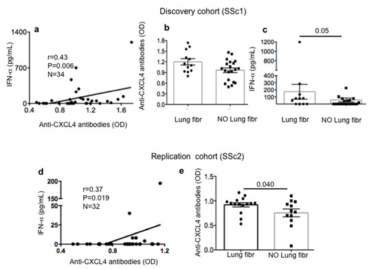 2.3. Anti-CXCL4 Antibody Reactivity in SSc Patients Correlates with Serum/Plasma IFN-α and Is Higher in SSc Patients with Lung Fibrosis