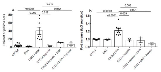 High and frequent antibody reactivity to CXCL4 could depend on the elevation of IFN-α in the circulation of SSc patients, as IFN-I is indeed boosting the production of antibodies in B-cells []. However, we wondered whether the adjuvant activity of CXCL4 in complex with nucleic acids could directly stimulate B-cells. To address this, we used an established protocol in which we isolated B-cells from HD PBMCs and stimulated them with CXCL4, DNA or CXCL4–DNA complexes for seven days [,]. As CXCL4 can form complexes with other polyanions, typically with heparin, we also used CXCL4 in complex with heparin to stimulate B-cells. In addition, we determined the effect of heparin on the CXCL4–DNA complex stimulation by treating the B-cells first with CXCL4–DNA complexes and adding heparin subsequently, or with CXCL4–heparin complexes with the addition of DNA afterwards. At the end of the culture, we estimated the percentage of B-cells that became CD19neg/CD27high/CD38pos/CD138pos (namely plasma cells []). We also measured whether the differentiated cells secreted IgG in their supernatants at the end of the culture [,].