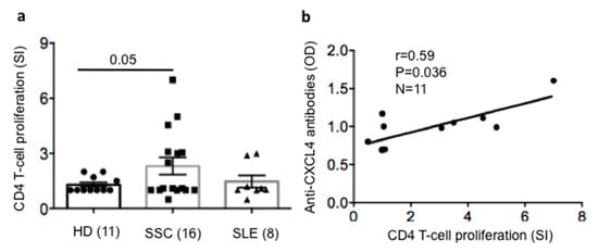 Disposing of PBMCs from the SSc patients of the replication cohort, we could test the proliferative response of SSc T-helper cells to CXCL4 by bromodeoxyuridine (BrdU) incorporation, as previously done with other autoantigens [,]. As shown in Figure 5a, six out of 16 (38%) SSc patients had T-cells that proliferated to CXCL4 (the gating strategy for proliferation assays is reported in Figure S2). The available SLE patients were also tested, showing that CXCL4 can also be immunogenic in SLE. This was plausible, given the past determination of autoantibodies to CXCL4 in SLE which concords with our present data []. HD PBMCs responded poorly to CXCL4. Despite the limited number of SSc patients tested, CXCL4-specific T-cell responses in SSc were significantly higher than those obtained in HD. Remarkably, a positive and significant correlation between the presence of autoantibodies and T-cell proliferation to CXCL4 was apparent (Figure 5b).
