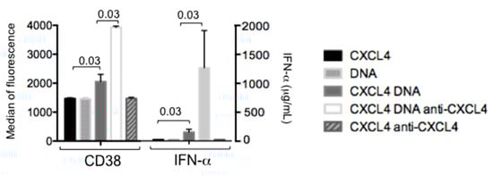 We have assumed that that the adjuvant activity of CXCL4–nucleic acid immune complexes implements IFN-I production, which in turn boosts the memory B-cell capacity to produce antibodies to CXCL4. One possibility is that autoantibodies to CXCL4 directly increment IFN-I production, which is already ensured by the formation and activity of CXCL4–DNA/RNA immune complexes [,]. To understand this, we prepared a CXCL4–DNA–IgG immune complex by pre-mixing CXCL4–DNA and an anti-CXCL4 antibody (see Methods) and challenged purified pDCs with this mixture. As a control, the same antibody was given to pDCs stimulated by CXCL4 alone. Figure 6 shows that a suboptimal stimulation of pDCs by CXCL4–huDNA complexes can induce a certain IFN-I response (seen as CD38 u-regulation, as CD38 is an IFN-induced factor [,]) and detection of low level IFN-α, as measured by ELISA. However, this response can be greatly augmented by the presence of anti-CXCL4 antibodies in the stimulatory complex. These results, although obtained with an artificial anti-CXCL4–CXCL4–DNA complex, suggest that one of the effector functions of anti-CXCL4 antibodies could be to concentrate and/or more efficiently deliver CXCL4–DNA complexes to immune cells (i.e., to pDCs) and further amplify IFN-α production in SSc. This finding also suggests the interesting possibility that CXCL4–anti-CXCL4 immune complexes circulating in SLE (or in other disease) could be interferogenic because they contain nucleic acids [,].