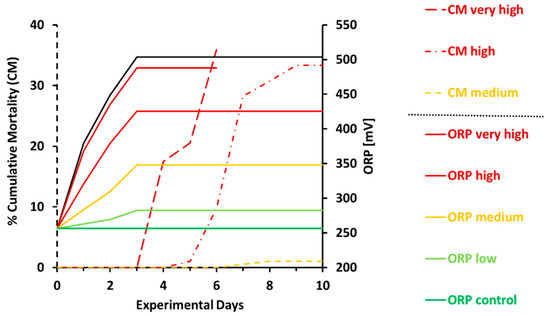 Mean cumulative treatment mortality (CM [%]; n = 3; dashed lines) and daily ozone dosage (solid lines) given as ORP = oxidation reduction potential [mV] during the experimental days. Control = 250 (228.0 ± 9.6) mV; low = 300 (282.3 ± 5.5) mV; medium = 350 (347.7 ± 5.5) mV; high = 425 (425.3 ± 15.3) mV; very high = 500 (488.3 ± 14.4) mV. Treatments were adjusted by mixing certain amounts of ozonated water from a header tank with untreated ozone free water. There was a gradual increase over 3 days of ozone dosage in the header tank: day 0 = 256.4 ± 2.3 mV, day 1 = 379.2 ± 22.4 mV, day 2 = 448.7 ± 11.6 mV, day 3 = 503.4 ± 18.5 mV, followed by 8 days of end concentration exposure except for the very high group where the experiment was stopped after 6 days due to high mortalities. Salinity 13‰, temperature 7 °C.