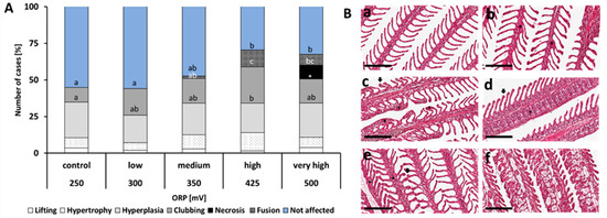 (A): Quantification of histopathological changes in the gills of Atlantic salmon exposed to 5 different ozone levels (250, 300, 350, 425 and 500 mV), expressed as oxidation reduction potential (ORP). Key histopathological parameters that were quantified include “not affected”, “fusion”, “necrosis”, “clubbing”, “hyperplasia”, “hypertrophy” and “lifting” (modified from Reiser et al. 2011). Different letters denote statistically significant differences (p < 0.5). (B): (a–f) Representative photographs of some of the pathologies in the gills. (a) Healthy gill lamellae with well-defined structures; (b) hyperplasia (*) at the base of a lamella; (c) different degrees of partial fusion (*) of the gill filaments and signs of lamellar clubbing (↓); (d) complete fusion of several lamellae (*) and early sign of epithelial lifting(↓); (e) signs of hyperplasic and hypertrophy (*) and clubbing and shortening of the lamella (↓); early stage of lamellar fusion from the base can be observed as well; (f) loss of brachial structure, heavy degeneration and evidence of necrotic tissues. Scale bar (―) = 200 µm.