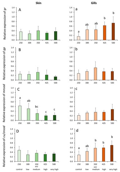 Relative expression of antioxidant defense genes in the skin (A–D) and gills (a–d) of Atlantic salmon exposed to varying ORP levels. Values are presented as mean and standard deviation of 6 individual fish per treatment group. Different letters denote significant difference between treatments at p < 0.05.
