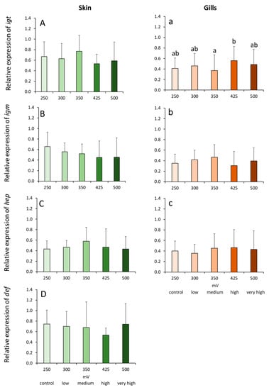 Relative expression of immunoglobulin and antimicrobial peptide genes in the skin (A–D) and gills (a–c) of Atlantic salmon exposed to varying ORP levels. Values are presented as mean and standard deviation of 6 individual fish per treatment group. Different letters denote significant differences between treatments at p < 0.05. Expression of def in the gills was almost negligible hence was not presented.