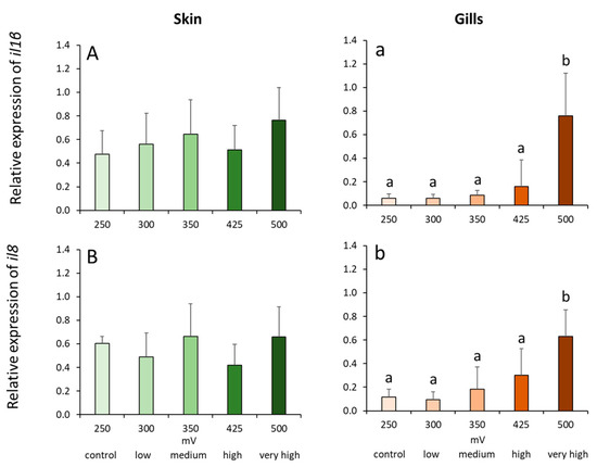 Relative expression of cytokine genes in the skin (A,B) and gills (a,b) of Atlantic salmon exposed to varying ORP levels. Values are presented as mean and standard deviation of 6 individual fish per treatment group. Different letters denote significant difference between treatments at p < 0.05.
