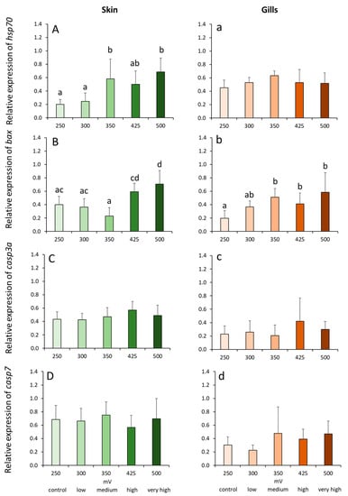Relative expression of stress and apoptosis-related genes in the skin (A–D) and gills (a–d) of Atlantic salmon exposed to varying ORP levels. Values are presented as mean and standard deviation of 6 individual fish per treatment group. Different letters denote significant difference between treatments at p < 0.05.