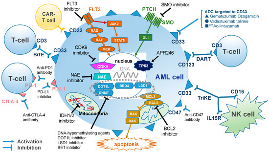 Abbreviation; AML, acute myeloid leukemia; ADC, antibody drug conjugate; α-KG, a-ketoglutarate; BAK, BCL-2 antagonist/killer; BAX, BCL-2-associated X protein; BCL2, B-cell leukemia/lymphoma 2; BET, bromodomain and extra-terminal motif; BiTE, bispecific T cell engagers; BRD, bromodomain; CAR, chimeric antigen receptor; CDK, cyclin dependent kinase; CTLA-4, cytotoxic T-lymphocyte-associated protein 4; DART, dual affinity retargeting molecules; DNMT, DNA methyltransferase; DOT1L, disruptor of telomeric silencing-1-like histone methyltransferase; FLT3, FMS-like tyrosine kinase 3; GLI, glioma-associated oncogene; IDH, isocitrate dehydrogenases; IL15R, interleukin 15 receptor; LSD1, lysine-specific histone demethylase 1; MCL1, myeloid cell leukemia 1; NAE, NEDD8-activating enzyme; PD-1, programmed cell death 1; PD-L1, programmed death-ligand 1; PTCH, Patched-1; SMO, smoothened; TriKE, trispecific killer cell engagers; 2HG, R-2-hydroxyglutarate