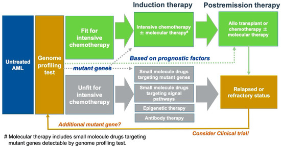 During treatments such as small molecule drugs targeting mutant genes, leukemia cells acquire secondary resistance (e.g., the acquisition of new gene mutations, secondary mutations in the same gene, and new alterations in signaling pathways) [121,122,123,124,125]. Not only upon new diagnoses but also at relapse or refractory periods, genome profiling analyses should be conducted to detect the secondary resistance of leukemia cells and select an optimal second line treatment in AML patients (Figure 2). In the future, more detailed secondary resistance mechanisms and the frequency of secondary resistance will be revealed [126].