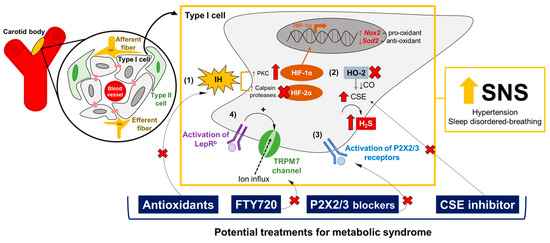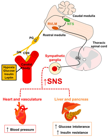 Metabolic syndrome affects approximately one-fifth of the US adult population [1,2,3]. It was originally described as a set of metabolic abnormalities that co-exist in the same individual with a high frequency [4,5,6]. There are different definitions of this condition, but nearly all of them include glucose intolerance, insulin resistance, dyslipidemia and hypertension [4]. This cluster is associated with a high-risk of cardiovascular disease and all-cause mortality [7]. The pathophysiology of metabolic syndrome is still not entirely clear, but an overactivation of the sympathetic nervous system (SNS) appears to play a critical role, since it is observed in most of the metabolic disturbances that compose metabolic syndrome [8]. Investigators proposed that there is a single peripheral sensor for multiple metabolic parameters [9], dysfunction of which may lead to metabolic dysregulation and the impaired blood–brain barrier transport of metabolites in obese subjects [10,11,12,13,14,15,16,17]. Multiple investigators attributed this peripheral sensing function to the carotid body (CB).