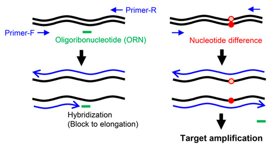 Nucleotide mutations can also be detected by blocking PCR [4], in which a blocker oligonucleotide hybridized to a target sequence suppresses PCR amplification across the target sequence in a sequence-specific manner. If the target sequence is mutated, hybridization is incomplete, and PCR amplification would not be suppressed. By monitoring DNA amplification, one can determine the presence or absence of mutations in a target sequence. Previously, we developed a form of blocking PCR, called oligoribonucleotide (ORN) interference-PCR (ORNi-PCR) [5], in which an ORN serves as the sequence-specific blocker, as shown in Figure 1. ORNs can be flexibly designed and cost-effectively synthesized, representing advantages over other blockers, such as artificial nucleic acids. We showed that ORNi-PCR can discriminate differences in nucleotide sequences, such as single-nucleotide mutations in cancer cells, as well as indel mutations introduced by genome-editing [6,7,8,9]. Thus, ORNi-PCR is a useful tool for use in the biological and medical fields.