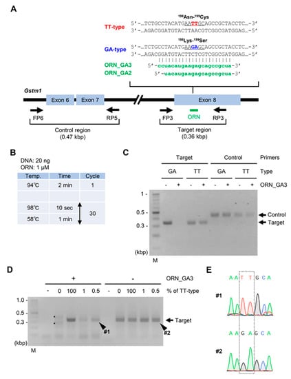 ORNi-PCR using DNA extracted from AFPE rat liver specimens to discriminate a polymorphism in the Gstm1 gene. (A) Positions of primers and ORNs targeting the GA-type allele of the rat Gstm1 gene. Arrows indicate forward and reverse primers for amplification of a target region (FP3 and RP3) and a control region (FP6 and RP5). (B) Experimental conditions for ORNi-PCR. (C) Results of ORNi-PCR. M—molecular weight marker. (D) Results of ORNi-PCR. ORNi-PCR with mixed DNA (0–100% of TT-type Gstm1 in total Gstm1) was performed as shown in (B) with 40 cycles of denaturation and annealing/elongation steps. In this experiment, 20 ng of AFPE DNA, including GA-type Gstm1, was mixed with AFPE DNA, including TT-type Gstm1, so that the TT-type Gstm1 accounted for 1 or 0.5% of the total Gstm1. The mixed DNA was used for ORNi-PCR. * indicates non-specific amplicons. (E) Results of DNA sequencing analysis. ORNi-PCR (#1) and PCR (#2) amplicons shown in (D) were subjected to DNA sequencing analysis. Sequencing signals around the polymorphism are shown.
