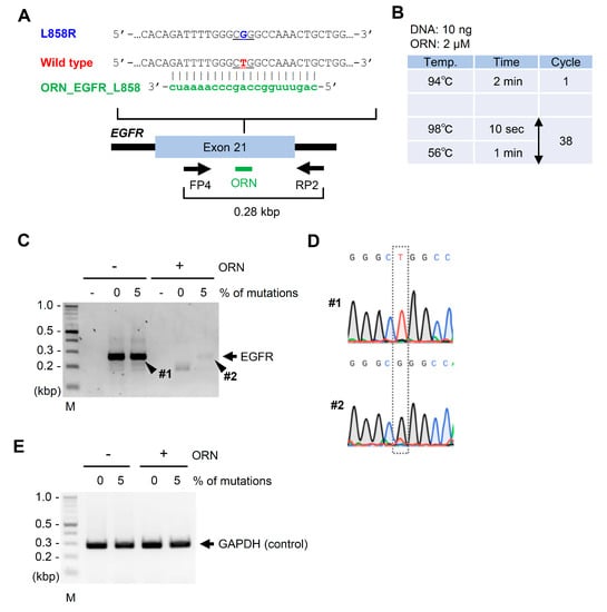 ORNi-PCR using DNA extracted from FFPE specimens to discriminate mutation of the EGFR gene. (A) Positions of primers and an ORN targeting a mutation corresponding to EGFR L858R in the human EGFR gene. Arrows indicate forward and reverse primers for amplification of the target region. (B) Experimental conditions for ORNi-PCR. (C) Results of ORNi-PCR. M—molecular weight marker. (D) Results of DNA sequencing analysis. ORNi-PCR (#2) and PCR (#1) amplicons shown in (C) were subjected to DNA sequencing analysis. Sequencing signals around the mutation are shown. (E) Results of ORNi-PCR targeting the irrelevant GAPDH gene.