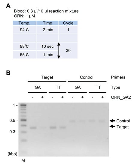 Rat whole blood samples were acquired following animal faculty guidelines and used directly as templates for ORNi-PCR. ORNi-PCR was performed using KOD FX (Toyobo, Osaka, Japan) in mixtures containing 0.3 μL whole blood, 0.3 µM each primer, and 1 µM ORN in a total volume of 10 μL. ORNi-PCR was performed at various temperatures for the annealing and elongation steps in the presence of different concentrations of ORNs along with a method to determine the optimal conditions [7]. An established optimal condition is shown in Figure 4A.