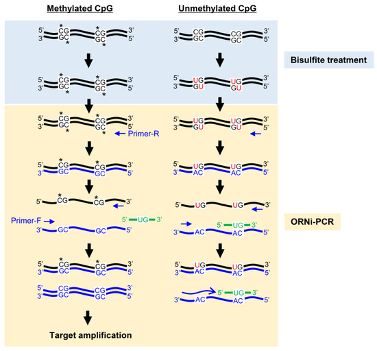 Schematic diagram of ORNi-PCR with bisulfite-treated DNA. Bisulfite-treated DNA is subjected to ORNi-PCR with an ORN corresponding to the converted target DNA sequence. In this scheme, an ORN (green line) targeting unmethylated CpG sites is hybridized with a corresponding DNA sequence synthesized in the first cycle of ORNi-PCR (blue line), which blocks target amplification.