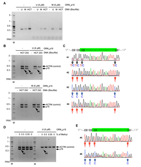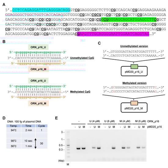 Next, we investigated whether ORNi-PCR is compatible with bisulfite-treated DNA. Bisulfite treatment converts unmethylated cytosines to uracils but leaves methylated cytosines unchanged, as shown in Figure 5. Bisulfite treatment followed by PCR with a methylation-specific primer set (methylation-specific PCR (MSP)) has been used to discriminate CpG methylation status [21,22]. PCR with a universal primer set, followed by DNA sequencing analysis, has also been used to analyze CpG methylation status at single-nucleotide resolution [22]. Analysis of CpG methylation is also useful in the medical field (e.g., in cancer diagnosis [23]). In this experiment, we sought to determine whether ORNi-PCR can discriminate CpG methylation status in a target region of bisulfite-treated DNA, as shown in Figure 5. For this purpose, we employed a mutant version of the KOD DNA polymerase (KOD -Multi & Epi-TM (Toyobo)) for ORNi-PCR because this polymerase effectively amplified a target region from bisulfite-treated DNA, as shown in Figure S4. We designed two ORNs targeting a CpG island of the human CDKN2A (p16) gene, ORN_p16_U and ORN_p16_M, targeting unmethylated and methylated CpG sites, respectively, as shown in Figure 6A,B and Figure S5. To evaluate those ORNs, we performed ORNi-PCR on plasmids pMD20_p16_M and pMD20_p16_U; pMD20_p16_U retains the DNA sequence corresponding to the bisulfite-treated unmethylated CpG island, whereas pMD20_p16_M retains the sequence corresponding to the bisulfite-treated methylated CpG island, as shown in Figure 6C (see the Materials and Methods section). As shown in Figure 6D,E, ORN_p16_U strongly suppressed amplification with pMD20_p16_U but not pMD20_p16_M. By contrast, ORN_p16_M suppressed amplification with pMD20_p16_M but not pMD20_p16_U, although the suppression was moderate. A standard concentration of ORNs (i.e., 1 μM) [7] was less effective, as shown in Figure S6.