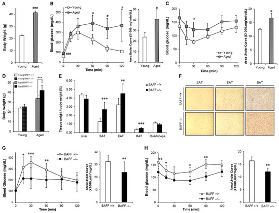 Aging aggravates insulin resistance and aged BAFF−/− (B-cell-activating factor) mice shows enhanced glucose tolerance despite increased body weight. Young and old mice were maintained on a normal chow diet for 2 months and 10 months, respectively. Changes of (A) body weight, (B) glucose tolerance and (C) insulin sensitivity were measured (n = 5). Mice fasted for 16 h, and the blood glucose levels were measured at 0, 15, 30, 60, 90 and 120 min after intraperitoneal injection of glucose (2 g/kg) or insulin (0.5 U/kg). BAFF−/− and C57BL/6J mice were maintained on a normal chow diet for 10 months. (D) Body weights of 2- and 10-month-old adult male mice (n = 4–12). (E) Tissue weights of 10-month-old mice (n = 9–12). (F) Hematoxylin and eosin (H&E) staining sections of adipose tissues. Adipose tissues were fixed in 10% v/v formalin/PBS, and then embedded in paraffin for staining with hematoxylin and eosin. Images were obtained under a microscope at a magnification of X100. (G and H) Glucose tolerance test and insulin tolerance test of 10-month-old male mice (n = 8–12). Data represent means ± SD. # p < 0.05 and ### p < 0.001 between young and old mice and * p < 0.05, ** p < 0.01, *** p < 0.001 between wild-type and BAFF−/− mice. SAT: subcutaneous adipose tissue, EAT: epididymal adipose tissue, BAT: interscapular brown adipose tissue.