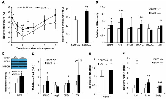 BAFF depletion supports uncoupling protein 1 (UCP1)-dependent thermogenesis and alternative macrophage activation in brown adipose tissue. (A) Body core temperature of 10-month-old wild-type or BAFF−/− mice. Measurements were performed at 0, 1, 2, 3, 4, 6 and 8 h during cold exposure at 4 °C (n = 4–5). (B) Effect of BAFF deficiency on thermogenic program gene expression (n = 9–12). Gene expression level is normalized with mRNA expression level of Arbp. (C) Effect of BAFF deficiency on UCP1 protein expression level (n = 4–5). Proteins were extracted from the tissue for SDS-PAGE-immunoblot analysis. Effect of BAFF deficiency on the expression of genes involved in (D) M2-like macrophage activation, (E) mature eosinophil cell marker and (F) anti-inflammatory cytokines (n = 9–12). Data represent means ± SD. * p < 0.05, ** p < 0.01, *** p < 0.001 between wild-type and BAFF−/− mice.