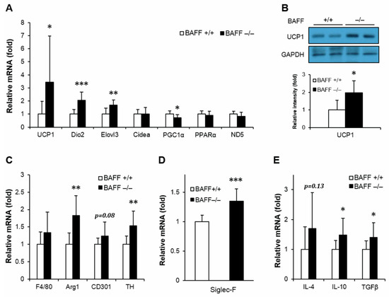 BAFF depletion enhances expression of genes involved in thermogenic program and alternative macrophage activation in subcutaneous adipose tissue. (A) Effect of BAFF deficiency on thermogenic program gene expression (n = 9–12). Gene expression level is normalized with mRNA expression level of Arbp. (B) Effect of BAFF deficiency on UCP1 protein expression level (n = 4–5). Proteins were extracted from the tissue for SDS-PAGE-immunoblot analysis. Effect of BAFF deficiency on the expression of genes involved in (C) M2-like macrophage activation, (D) mature eosinophil cell marker and (E) anti-inflammatory cytokine (n = 9–12). Data represent means ± SD. * p < 0.05, ** p < 0.01, *** p < 0.001 between wild-type and BAFF−/− mice.