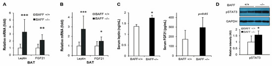 We have previously reported that BAFF−/− mice fed with a high-fat diet had enhanced leptin and FGF21 expression in adipose tissues [18]. Moreover, in this study it was also found that the mRNA expressions of leptin and FGF21 were significantly up-regulated in both BAT and SAT of aged BAFF−/− mice compared to their WT controls (Figure 4A,B). Consistent with the increased mRNA levels, serum concentrations of leptin and FGF21 were also considerably higher in BAFF−/− mice than WT controls (Figure 4C). In addition, phosphorylation of STAT3, which mediates leptin action [19], was significantly higher in BAT of BAFF−/− mice than in WT counterparts (Figure 4D).