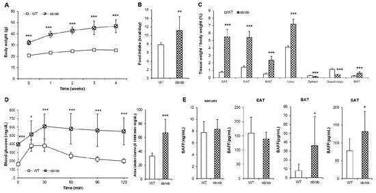 ob/ob mice shows deteriorated glucose tolerance with tissue-specific increase of BAFF expression. Leptin-deficient (ob/ob) mice and C57BL/6J (wild-type, WT) mice were maintained on a normal chow diet for 5 weeks. (A) Changes of body weight over 5 weeks (n = 10). Changes of (B) average calorie intake and (C) tissue weights (n = 10). (D) Glucose tolerance test of WT and ob/ob mice (n = 10). Mice fasted for 16 h, and the blood glucose levels were measured at 0, 15, 30, 60, 90 and 120 min after intraperitoneal injection of glucose (2 g/kg). (E) Protein BAFF concentration in serum and adipose tissues (n = 8). Data represent means ± SD. * p < 0.05, ** p < 0.01, *** p < 0.001 between wild-type and ob/ob mice. SAT: subcutaneous adipose tissue, EAT: epididymal adipose tissue, MAT: mesenteric adipose tissue, BAT: interscapular brown adipose tissue.