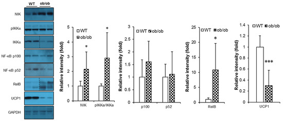 BAFF signaling is up-regulated in brown and subcutaneous adipose tissues of ob/ob mice. Effect of leptin deficiency on protein levels of BAFF signaling molecules and UCP1 in brown adipose tissue (n = 6–8). Proteins were extracted from the tissue for SDS-PAGE-immunoblot analysis. Data represent means ± SD. * p < 0.05 and *** p < 0.001 between wild-type and ob/ob mice.