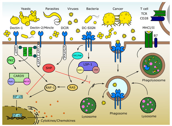 - Sancho, D.; Sousa, E.C.R. Signaling by myeloid C-type lectin receptors in immunity and homeostasis. Annu. Rev. Immunol. 2012, 30, 491–529. [Google Scholar] [CrossRef] [PubMed]