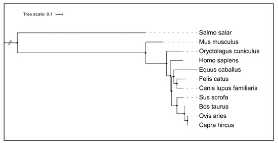 Hierarchical clustering of amino acid sequences comprising Dectin-1 (Clec7a) CTLs of selected animal species, and humans. For the Atlantic salmon (Salmo salar), missing a corresponding ortholog Dectin-1 encoding gene, a functional ortholog C-type lectin receptor C was chosen. Remarkably, the degree of similarity in the Dectin-1 amino acid sequences mirrors the phylogenetic relationships between the respective species. Visualization and clustering were performed with NGPhylogeny.fr suite [62].