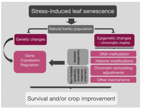 In conclusion, crop senescence involves major reprogramming of gene expression, and recent research has revealed complex regulatory mechanisms, including the hierarchical action of many TFs, but also a higher-order regulation via alterations in chromatin structure. Epigenetic control of the level of senescence-inducing signals, which is connected to the overall environmental cues and the developmental program, is then possible. There is rapidly accumulating evidence that gene regulation of these pathways includes differential changes in chromatin status, switching from transcriptionally inactive heterochromatin to actively transcribed euchromatin, and vice versa. This control level is implemented by different but interacting and often interdependent epigenetic mechanisms, including, described above, DNA methylation, covalent histone modifications, and non-covalent chromatin remodeling. It may allow a rapid response to signaling and stimuli when the expression of a group of proteins (which can range from tens to thousands) needs to be adjusted immediately. The genetic and epigenetic changes may act alone or together and regulate the gene expression, which may result in nonheritable and heritable (stress memory) changes and may lead to survival and/or crop improvement (Figure 1).