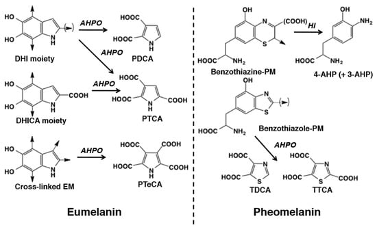 Alkaline hydrogen peroxide oxidation (AHPO) and hydroiodic acid (HI) hydrolysis of eumelanin and pheomelanin. 5,6-dihydroxyindole (DHI), 5,6-dihydroxyindole-2-carboxylic acid (DHICA), pyrrole-2,3-dicarboxylic acid (PDCA), pyrrole-2,3,5-tricarboxylic acid (PTCA), pyrrole-2,3,4,5-tetracarboxylic acid (PTeCA), thiazole-4,5-dicarboxylic acid (TDCA), thiazole-2,4,5-tricarboxylic acid (TTCA), 4-amino-3-hydroxyphenylalanine (4-AHP), 3-amino-4-hydroxyphenylalanine (3-AHP).