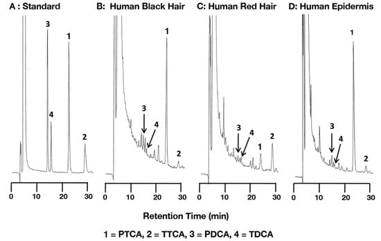 Finally, human epidermal samples (n = 18) with varying degrees of constitutive pigmentation, ranging from very light to dark, were examined for correlations. These epidermal samples are identical to those used in our previous study (n = 35) [] but were selected for this study. Figure 6 shows good to excellent correlations with slopes close to 1.0 with both HPLC methods for PTCA, PTeCA, and TTCA. PDCA values were not compared because a peak interfered with PDCA in the original HPLC method. PTeCA and TTCA values in the original method had background values of 2.2 ng/mg and 1.4 ng/mg, respectively. Also, there was a small interfering peak appearing close to TDCA in the improved HPLC method. The results of detailed chemical analyses are presented in Table S4 and Figure S1, which gave results closely resembling those in the previous study []. Figure 2D illustrates a typical HPLC chromatograph for dark epidermis.