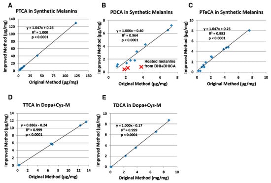 Correlations between the original and improved HPLC methods for analysis of synthetic melanins. (A) PTCA, (B) PDCA, (C) PTeCA, (D) TTCA, and (E) TDCA. Synthetic melanins were prepared by tyrosinase oxidation of mixtures of dopa and cysteine (cys) at ratios of 1:0, 1:0.5 and 1:1 and of mixtures of DHI and DHICA at ratios of 1:0, 1:1 and 0:1, and were then heated at 100 ℃ for 8 days (aged melanins) []. The AHPO mixtures were analyzed both by the original HPLC method [] and by the improved HPLC method (this study). Outliers are indicated by red x. Units for x- and y-axis are μg/mg. Dopa+Cysteine melanins (Dopa+Cys-M).