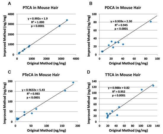 Correlations between the original and improved HPLC methods for AHPO of mouse hair samples. (A) PTCA, (B) PDCA, (C) PTeCA, and (D) TTCA. The AHPO mixtures were analyzed both by the original HPLC method [] and by the improved HPLC method (this study). Units for x- and y-axis are ng/mg.