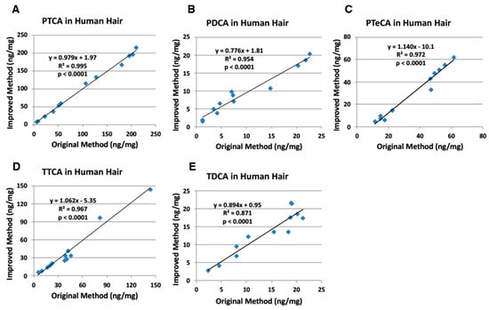 Correlations between the original and improved HPLC methods for AHPO of human hair samples. (A) PTCA, (B) PDCA, (C) PTeCA, (D) TTCA, and (E) TDCA. The AHPO mixtures were analyzed both by the original HPLC method [] and by the improved HPLC method (this study). Units for x- and y-axis are ng/mg.