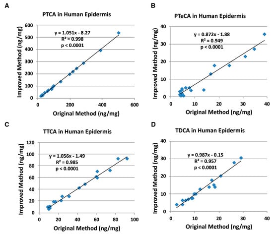 Correlations between the original and improved HPLC methods for human epidermal samples. (A) PTCA, (B) PTeCA, (C) TTCA, and (D) TDCA. The AHPO mixtures were analyzed both by the original HPLC method [] and by the improved HPLC method (this study). Units for x- and y-axis are ng/mg.
