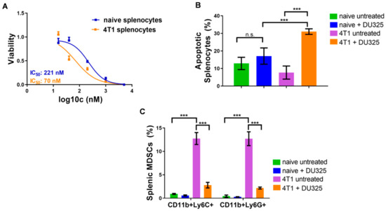 2.5. DU325 Treatment Ex Vivo Reduced Both Monocytic and Granulocytic Splenic MDSCs from the 4T1 Murine Breast Cancer Model
