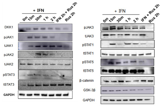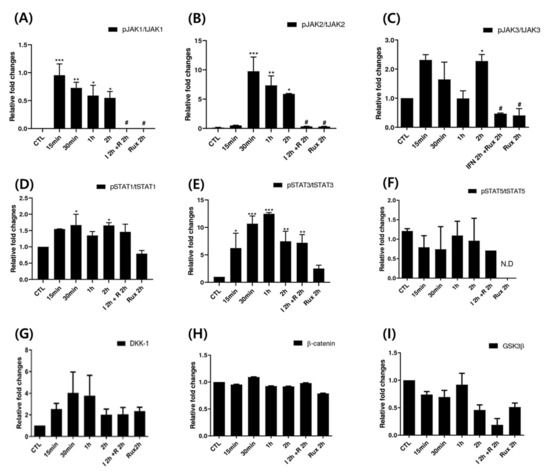 Changes in Janus kinase (JAK)-signal transducers and activators of transcription protein (STAT) pathway-related molecules after treatment with ruxolitinib. Western blotting showed changes in the levels of phosphorylated (A) JAK1, (B) JAK2, and (C) JAK3, (D) STAT1, (E) STAT3, and (F) STAT5, and (G) DKK1, (H) β-catenin, and (I) GSK-3β. The bands indicate serial protein expression levels up to 2 h after ruxolitinib treatment. The data represent the means ± SEM, n = 4, statistically significant at * p < 0.05, ** p < 0.01, *** p < 0.001 compared to control and # p < 0.05 compared with the IFN-γ-2 h treated group.