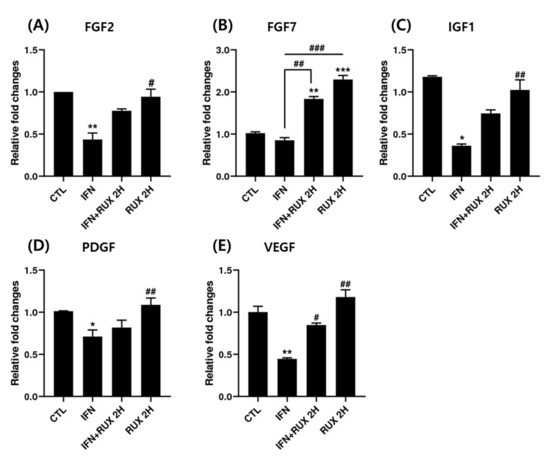 2.5. Effects of Ruxolitinib on the mRNA Expression of Growth Factors in IFN-γ-Treated hDPCs