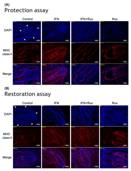 In normal scalp-hair follicles, the expression of major histocompatibility complex (MHC) class I and II is detected only under disruption of HF-IP. Individual anagen VI HFs were microdissected and separated from mice snout skin and were cultured as an HF organ [21]. Two different HF organ cultural settings were done and compared somewhat as described by Kinori et al. [21]: in a “restoration assay”, HFs were pretreated with IFN-γ to induce IP collapse, and then ruxolitinib was added. Alternatively, in a “protection assay”, HFs were first treated with ruxolitinib, followed by the addition of IFN-γ. The effect of ruxolitinib on the expression of MHC class I and II (Genetex, INC., Irvine, CA, USA) in HFs was evaluated by immunohistochemistry. The immuno-positive cells were counted and converted to % format using the ImageJ analysis system (ImageJ; NIH, Bethesda, MD, USA).