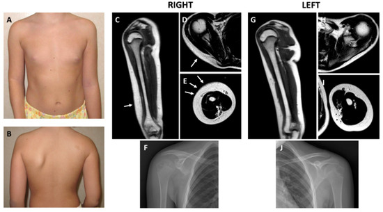 Clinical and radiologic features. (A) Front view showing limitation of the extension of the right elbow with accentuation of the cutaneous articular fold. (B) Back view demonstrating hypoplasia of the right scapula; note a small café-au-lait spot in the upper scapular region. Radiological findings of the right upper limb. (C) Thickening of the dermis of the lateral side of the arm at Magnetic Resonance Imaging (MRI) coronal view (arrow). (D) Thickened dermis at the scapular level (arrow). (E) Thickened dermis surrounding the arm muscles at axial view (arrows). (F) Plain radiograph documenting hypoplasia of the inferior part of the right scapula. Radiological findings of the left upper limb. Comparison with similar MRI sections of the affected (right) side demonstrated normal representation of the dermis at coronal (G), and upper (H) and lower (I) axial views. Muscles are underdeveloped in the right arm. (J) Normal left scapula at standard X-rays.