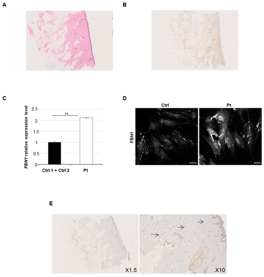 Multiple lines of evidence have suggested a contribution of the connective tissue protein Fibrillin 1 to the pathogenesis of profibrotic phenotypes. Therefore, although we did not find any causative variant in FBN1, we explored the FBN1 transcriptional level in the patient’s skin. qPCR analysis revealed that the patient’s fibroblasts expressed a higher level of FBN1 transcripts compared to controls (Figure 2C). Immunofluorescence (Figure 2D) and immunohistochemistry (Figure 2E) assays with anti-Fibrillin 1 Ab on patient’s fibroblasts and dermal biopsy, respectively, confirmed an intracellular accumulation of detected protein.