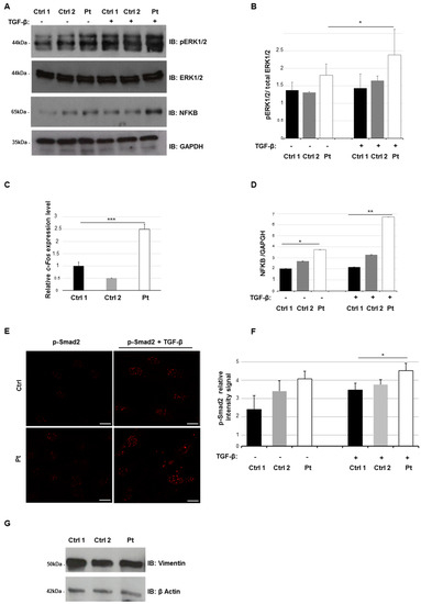 As ERK1/2 activation controls the levels of the transcription factor nuclear factor-kB (NFkB) [27], we next explore the effect of ERK1/2 activation on NFkB levels by performing an immunoblotting analysis. We found significant increased levels of NFkB in patient’s fibroblasts compared to controls, even upon TGF-β stimulation (Figure 3A,D).