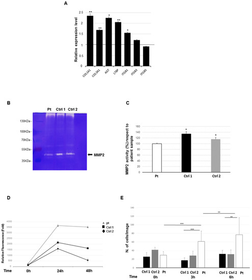 Analysis of fibrotic profile and proliferation study. (A) Trans-activation of pro-fibrotic genes was assessed by qPCR monitoring endogenous levels of COL1A1, COL3A1, AGT, LTBP1, IGTB1, IGTB3, and IGTB5. The fold change value is relative to the mean expression levels of two controls, which were set as value 1 and showed by a dashed line on the histogram. Scale bars represent standard errors. Values are expressed as mean ± SEM (* p < 0.05, ** p < 0.03, n = 3). (B) Representative gelatin zymography for matrix metalloproteinase-2 (MMP2), from patient (Pt) and two control (Ctrl) lines. The molecular weight is indicated. (C) Quantification of MMP2 activity based on zymography assay. Experiments were performed in triplicate, * = p < 0.05. (D) Graphic result of viability assay (PrestoBlu) in patient and controls cells. The rate of proliferation viability was annotated for 48 h. Results were statistically analyzed by ANOVA test. (E) Quantitative analysis of cell migration is given as the mean ± SD of cells per field. Results were normalized against the control gel condition. ** p < 0.03, *** p < 0.01.